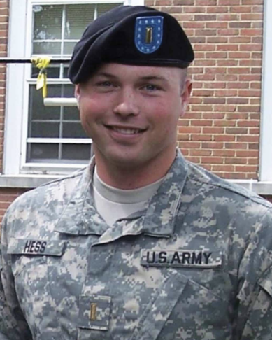 Robert Joseph “RJ” Hess joined ROTC in college and was commissioned a second lieutenant in the United States Army in 2010. He attended the Basic Officer Leaders Course and flight school from June 2011 to November 2012. After completing pilot training at Fort Rucker, Alabama, he was assigned to the 10th Mountain Division at Fort Drum. RJ served as a UH-60M Blackhawk pilot and mission planner.